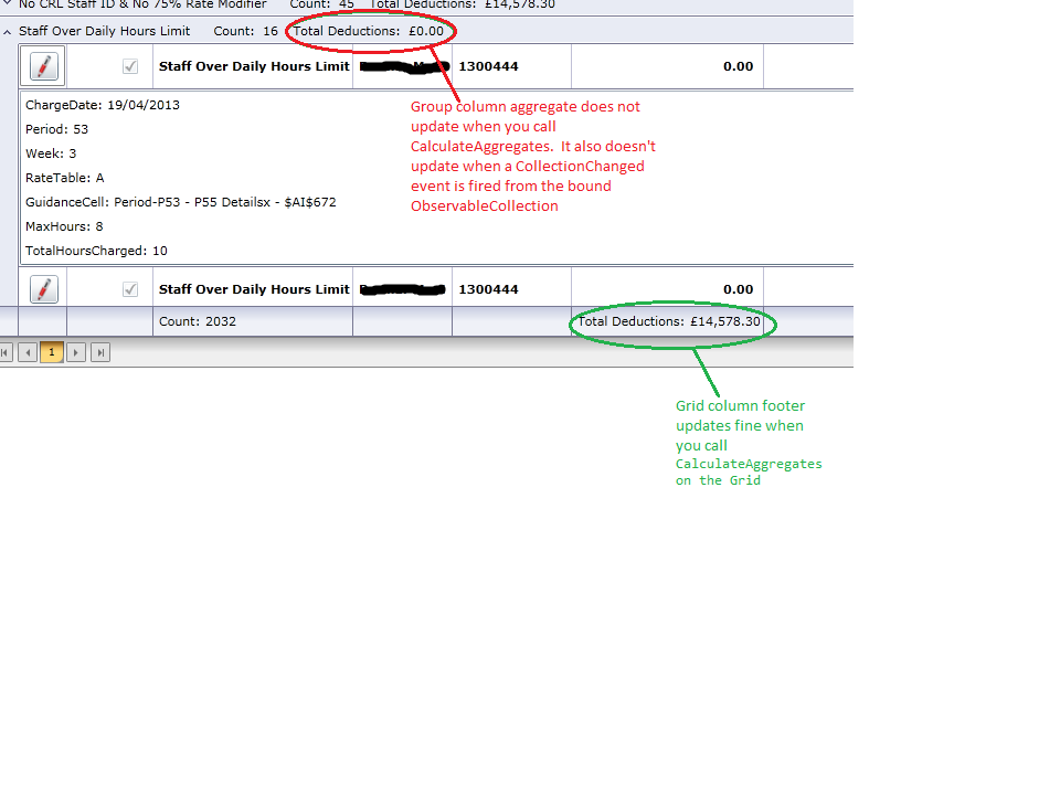 There are now two Liverpool clubs. Run the test program and group by Name. You should see two records under the Liverpool grouping with a sum stadium capacity of 118267. Now click the "Update Value on first item" button. The first Liverpool record has the statium capacity changed to 39, however, the column aggregate still states that the sum is 118267. It has not been updated correctly. Please confirm whether you see the same behavior.