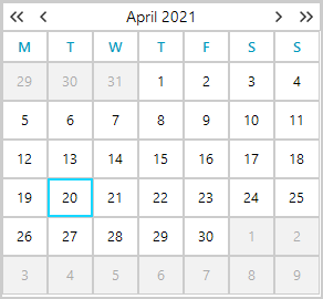 When the form is loaded, I want the Calendar to display the month for the system date, and select all days in the associated week for the system date, using a Sunday - Saturday week format. So if today is Aug 3, 2016, I would want the Calendar to display 7 columns, 6 rows, showing dates Jul 31, 2016 to Sep 10, 2016, with the dates for the current week, Jul 31, 2016 to Aug 6, 2016 selected.
