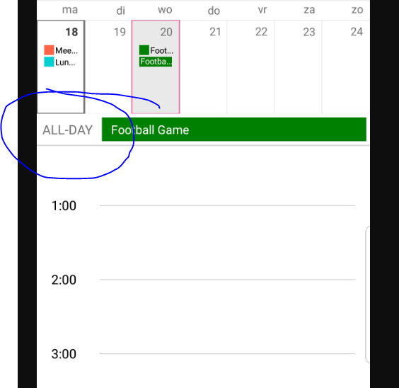 Currently in the android version the day view of the calendar there seems to be a bug. When there is an all-day appointment selected it will normally display the all-day header appointment item. If we select another date and go back to the date before it will not always show the all-day header item. This can be seen in the images that are attached to this post.