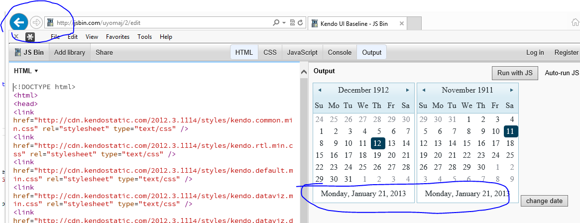 <span data-role="calendar" data-bind="value: selectedBlock.Start" disabled="disabled"></span> <span data-role="calendar" data-bind="value: selectedBlock.End" disabled="disabled"></span>