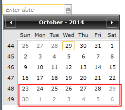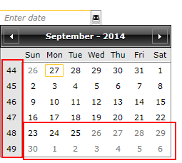 Result-Semptember.png shows the same days except some are disabled and some are not (which is incorrect). Also, notice the week numbers on left hand side doesn't update. These week numbers are from the month of December. If you keep going back on the calendar, the week numbers will not be updated either.