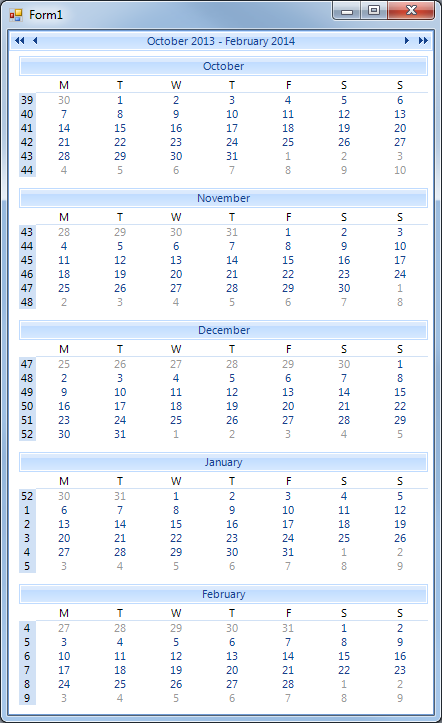 public Form1(){ InitializeComponent(); radCalendar1.AllowMultipleView = true; radCalendar1.MultiViewColumns = 1; radCalendar1.MultiViewRows = 5; radCalendar1.ShowRowHeaders = true; CultureInfo ci = new CultureInfo("en-US"); CalendarWeekRule weekRule = CalendarWeekRule.FirstFullWeek; ci.DateTimeFormat.CalendarWeekRule = weekRule; radCalendar1.Culture = ci;}I hope this information helps. Should you have further questions, I would be glad to help.