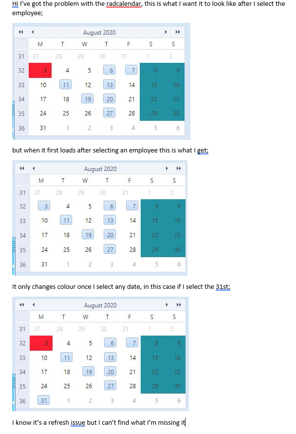 Hi I’ve got the problem with the radcalendar please see the attached as that shows you what i'm looking to produce.