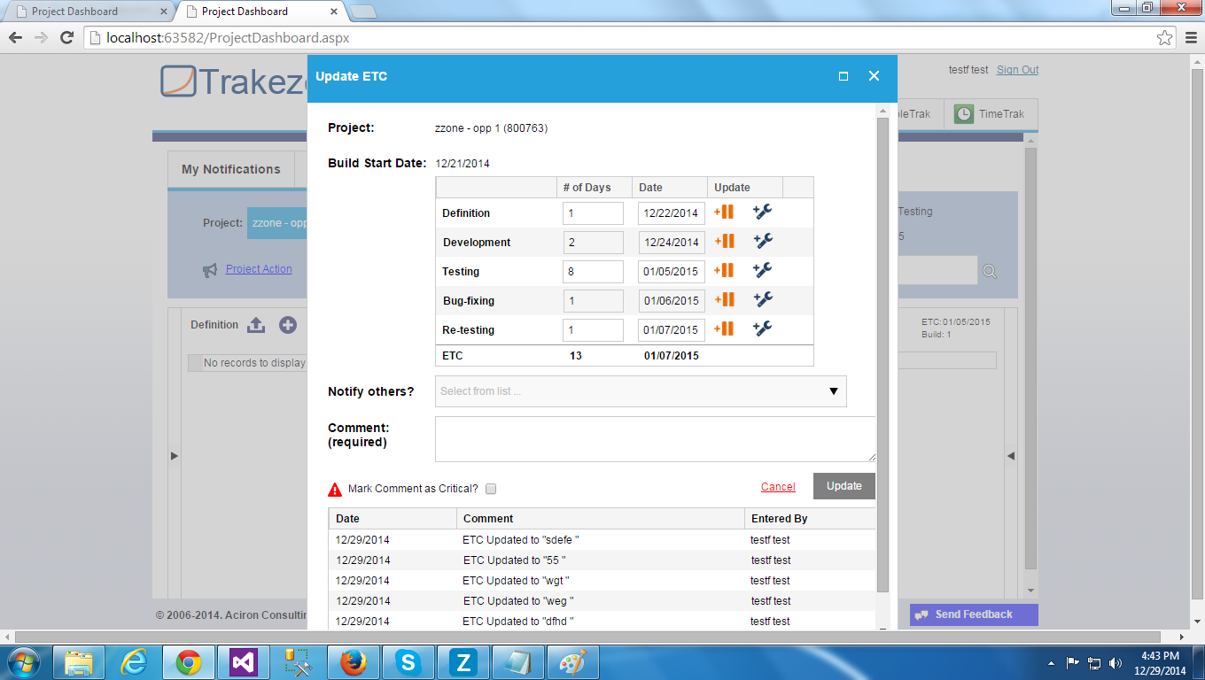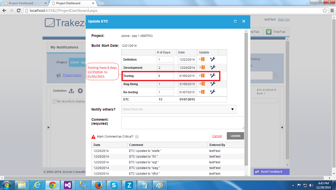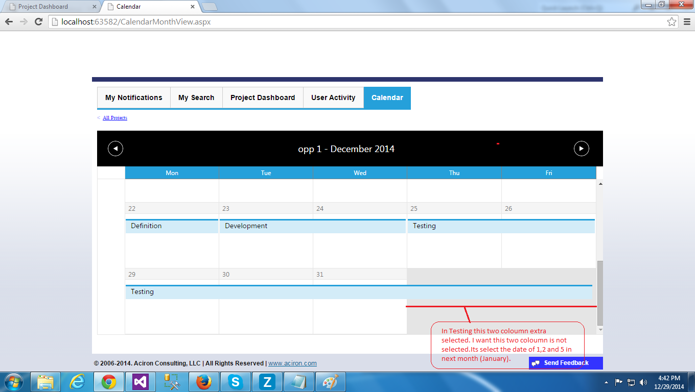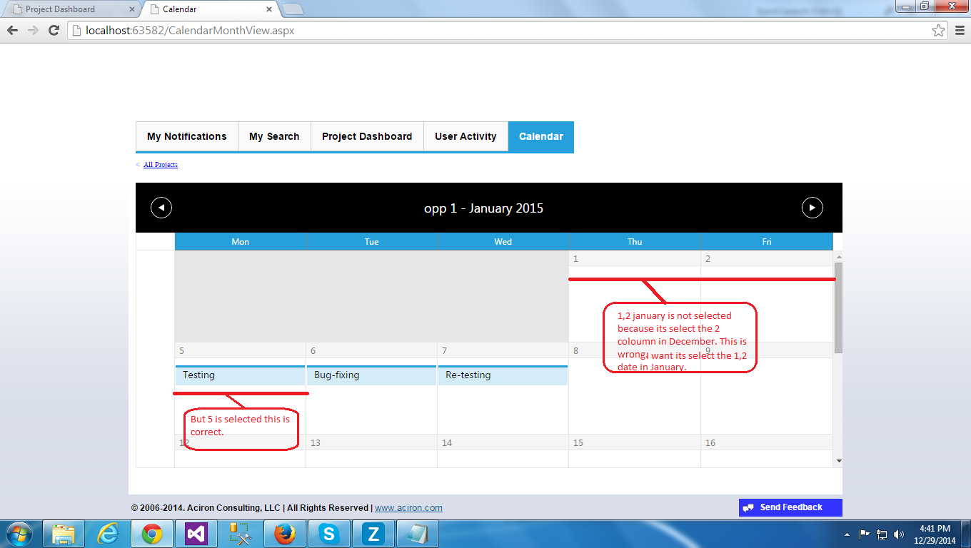 I used the Rad Scheduler For selection of Etc Date in calendar. So When Testing have the 8 days (12/25/2014 to 01/05/2015) in Update Etc then selection of date 12/25/2014 to 12/31/2014 and extra 2 column selected in December month in calender. And the next month (January) selected date only 01/05/2015. 01/01/2015 and 01/02/2015 date not selected it is wrong. Its should be select the 01/01/2015 and 01/02/2015 date, means it should be select total 12/25/2014 to 01/05/2015 , not select the 2 extra column in calender.