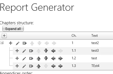 using System;using System.Web.UI;using System.Web.UI.WebControls;using System.Web.UI.WebControls.WebParts;using System.Collections;using Microsoft.SharePoint;using System.Collections.Generic;using Microsoft.SharePoint.Linq;using Telerik.Web.UI;using System.Data;using System.Linq;using MSH.DocumentCreator.DataAccess;using MSH.DocumentCreator;using MSH.DocumentCreator.DocumentGeneration;namespace MSH.DocumentCreator.ChapterEditor{ public partial class ChapterEditorUserControl : UserControl { ReportStructure _docStructure; DataTable _textModules; IEnumerable<int> selectedTextModules; ReportStructure DocumentStructure { get { if (_docStructure == null) _docStructure = new ReportStructure(); return _docStructure; } } private Dictionary<int, double?> itemOrderMaxValuesByParent = new Dictionary<int, double?>(); private Dictionary<int, double?> itemOrderMinValuesByParent = new Dictionary<int, double?>(); private Dictionary<int, string> itemChapterNumber = new Dictionary<int, string>(); private Dictionary<int, int> chapterParentIds = new Dictionary<int, int>(); protected override void OnLoad(EventArgs e) { base.OnLoad(e); selectedTextModules = new List<int>(); foreach (ChaptersItem item in DocumentStructure.Chapters) { selectedTextModules = selectedTextModules.Union(item.LinkId.Select(l => l.Value)); } } protected void btnExpandAll_Click(object sender, EventArgs e) { RadTreeList1.ExpandAllItems(); } #region Commands protected void RadTreeList1_InsertCommand(object sender, TreeListCommandEventArgs e) { this.DocumentStructure.Chapters.InsertOnSubmit(GetChapter(e.Item as TreeListDataInsertItem)); this.DocumentStructure.SaveChapters(); } protected void RadTreeList1_UpdateCommand(object sender, TreeListCommandEventArgs e) { GetChapter(e.Item as TreeListDataItem); this.DocumentStructure.SaveChapters(); ReBind(); } public void RadTreeList1_ItemCommand(object sender, TreeListCommandEventArgs e) { if (e.CommandName == "InitInsert" || e.CommandName == "PerformInsert" || e.CommandName == "Edit" || e.CommandName == "Cancel") return; ChaptersItem currentItem = GetChapter(e.Item as TreeListDataItem); int id = (e.Item as TreeListDataItem).GetId("ID"); switch (e.CommandName) { case "Left": DocumentStructure.MoveLeft(currentItem); break; case "Right": DocumentStructure.MoveRight(currentItem); break; case "Up": DocumentStructure.MoveUp(currentItem); break; case "Down": DocumentStructure.MoveDown(currentItem); break; case "Delete": DocumentStructure.DeleteRecursively(currentItem); DocumentStructure.SaveChapters(); break; default: break; } RadTreeList1.Rebind(); } #endregion #region Binding protected void RadTreeList1_NeedDataSource(object sender, TreeListNeedDataSourceEventArgs e) { RadTreeList1.DataSource = DocumentStructure.Chapters.OrderBy(ch => ch.ItemOrder).ToList<ChaptersItem>(); } protected void RadTreeList1_DataBinding(object sender, EventArgs e) { ReportParts tm = new ReportParts(); _textModules = tm.GetByContentType("Text-Module", "Text Module"); } public void RadTreeList1_ItemDataBound(object sender, TreeListItemDataBoundEventArgs e) { if (e.Item is TreeListHeaderItem) { (e.Item.Controls[0].Controls[0] as Button).ToolTip = MSH.DocumentCreator.Modules.UIResources.MSH_DocumentCreatorUI.ChapterEditor_AddChapterText; } switch (e.Item.ItemType) { case TreeListItemType.EditItem: DropDownList ddlStatus = e.Item.FindControl("ddlStatus") as DropDownList; ChaptersItem spItem = null; if (e.Item is TreeListDataItem) spItem = this.DocumentStructure.GetChapter((e.Item as TreeListDataItem).GetId("ID")); if (spItem != null && spItem.Status.HasValue) ddlStatus.SelectedValue = spItem.Status.Value.ToString(); CheckBoxList chkListTextModules = e.Item.FindControl("textModulesList") as CheckBoxList; if (spItem != null) { var item = DocumentStructure.GetChapter(spItem.ID.Value); PopulateHierarchyDictionaries(item); } if (chkListTextModules != null) { chkListTextModules.DataSource = GetUnusedOrOwnTextModules(spItem == null ? null : spItem.LinkId); chkListTextModules.DataTextField = "Title"; chkListTextModules.DataValueField = "ID"; chkListTextModules.DataBind(); } if (spItem != null && spItem.LinkId != null && spItem.LinkId.Count != 0) { foreach (int? docId in spItem.LinkId) { foreach (ListItem item in chkListTextModules.Items) if (docId.Value.ToString() == item.Value) { item.Selected = true; } } } if (spItem != null) { Label lblChNumber = e.Item.FindControl("lblChapterNumber") as Label; lblChNumber.Text = itemChapterNumber[spItem.ID.Value]; } break; case TreeListItemType.Item: case TreeListItemType.AlternatingItem: int id = (e.Item as TreeListDataItem).GetId("ID"); var currentItem = DocumentStructure.GetChapter(id); var parentChapterId = currentItem.ParentChapter ?? -1; PopulateHierarchyDictionaries(currentItem); if (!itemOrderMinValuesByParent[parentChapterId].HasValue || itemOrderMinValuesByParent[parentChapterId] >= currentItem.ItemOrder) { ImageButton upButton = e.Item.FindControl("UpButton") as ImageButton; upButton.Enabled = false; upButton.ImageUrl = "/_layouts/Images/DocumentCreator/up_gray.png"; } if (!itemOrderMaxValuesByParent[parentChapterId].HasValue || itemOrderMaxValuesByParent[parentChapterId] <= currentItem.ItemOrder) { ImageButton downButton = e.Item.FindControl("DownButton") as ImageButton; downButton.Enabled = false; downButton.ImageUrl = "/_layouts/Images/DocumentCreator/down_gray.png"; } if (!currentItem.ParentChapter.HasValue) { ImageButton leftButton = e.Item.FindControl("LeftButton") as ImageButton; leftButton.Enabled = false; leftButton.ImageUrl = "/_layouts/Images/DocumentCreator/left_gray.png"; } if (!DocumentStructure.Chapters.Any(ch => ch.ParentChapter == currentItem.ParentChapter && ch.ItemOrder < currentItem.ItemOrder)) { ImageButton rightButton = e.Item.FindControl("RightButton") as ImageButton; rightButton.Enabled = false; rightButton.ImageUrl = "/_layouts/Images/DocumentCreator/right_gray.png"; } Repeater textModulesRepeater = e.Item.FindControl("textModulesRepeater") as Repeater; if (textMod