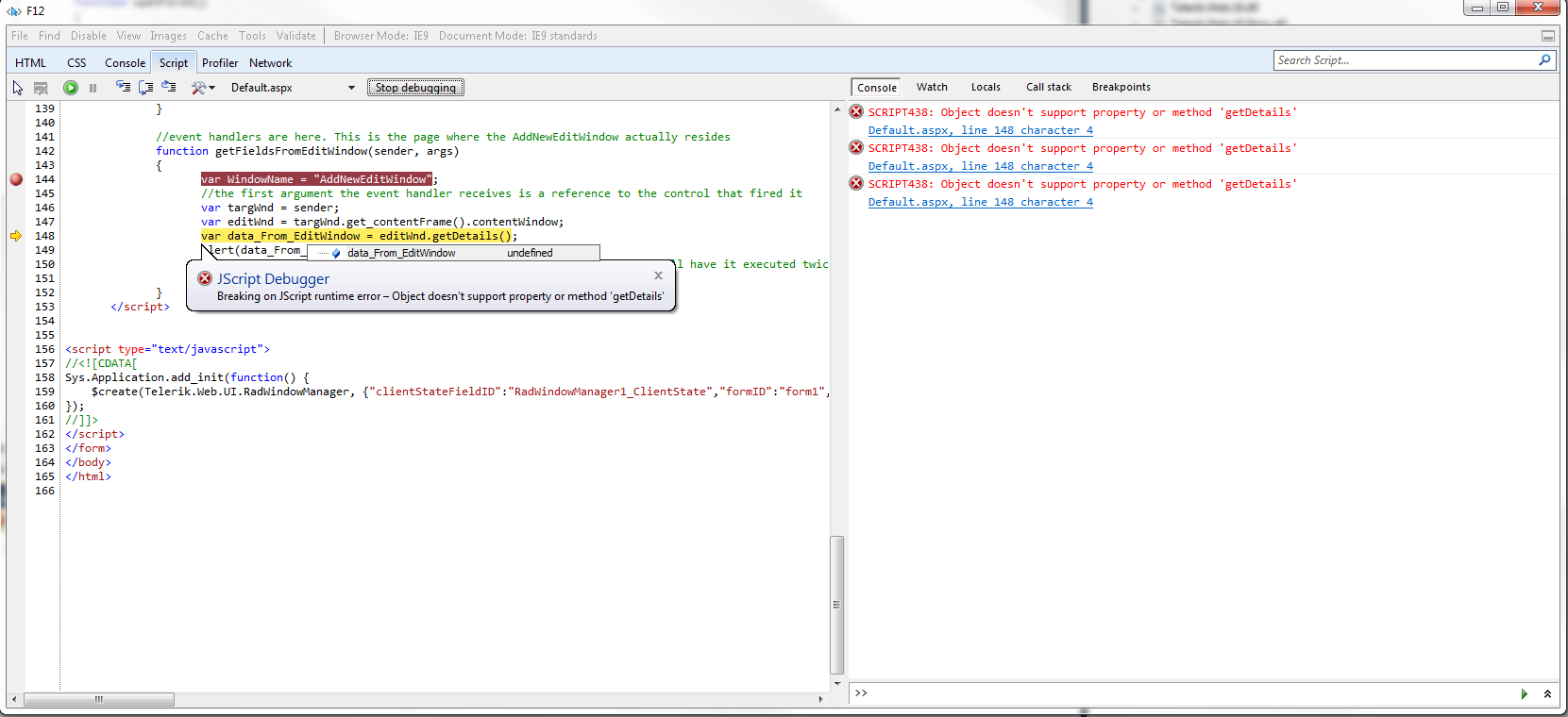 getDetails() function in Edit.aspx is called successfully in chrome and mozilla but in IE it is failing