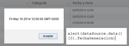 alert(kendo.toString(dataSource.data()[0].fechaGeneracion, "d"))I would also recommend checking the date formatting article for additional details.