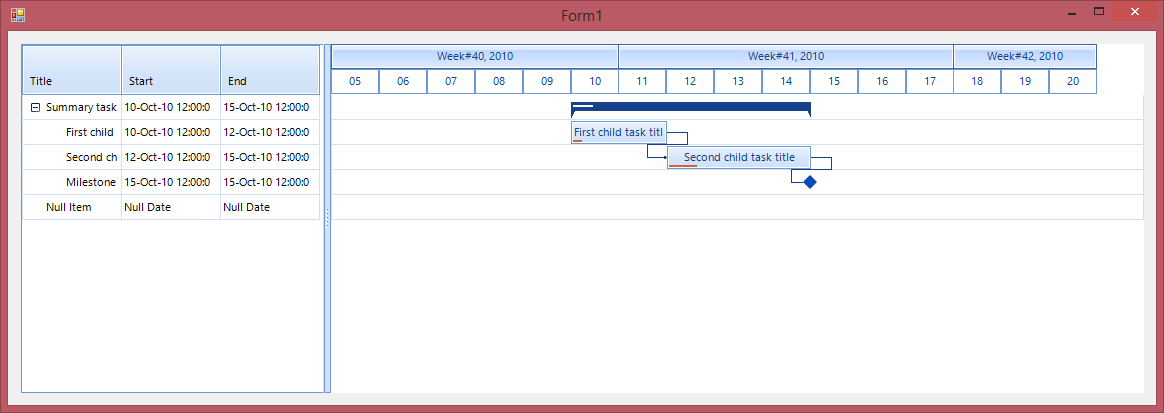 When the RadGanttView is data bound it does not allow nulls for the start date and end date of a data item. The elements are positioned in the graphical view according to the provided links and dates.