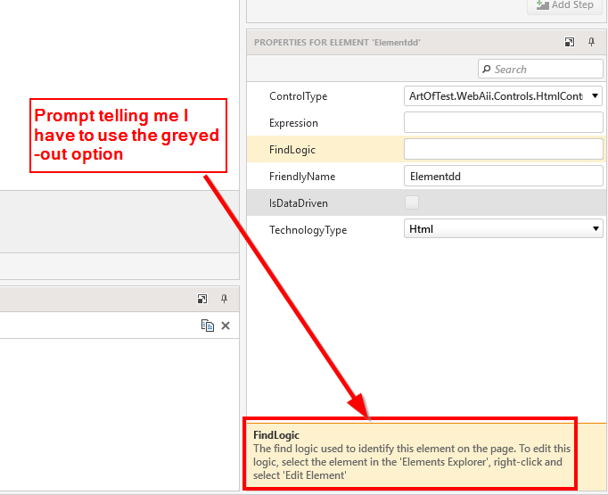 I have gotten to the point where it would be useful to create a custom element. However, I can not perform edits on custom elements I create, such as setting the find logic. I have read the documentation and I can see no reason why this would be. Please see screenshots for my issue.