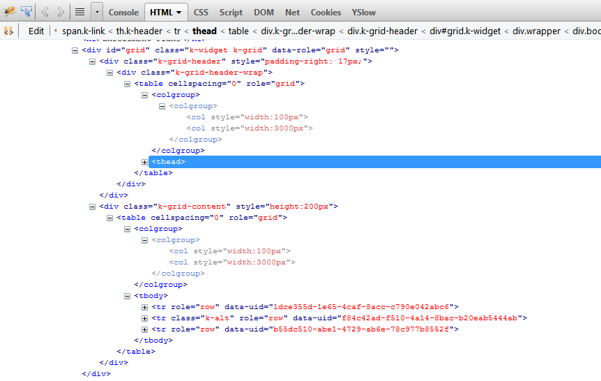 @(Html.Kendo() .Grid<MyModel> .Name("grid") .DataSource(…) .Scrollable() .Columns(columns => { columns.Bound(…).Width(300); columns.Bound(…).Width(200); columns.Bound(…).Width(300); columns.Bound(…).Width(200); columns.Bound(…).Width(200); columns.Bound(…).Width(500); }))This results in a table that squishes the columns to fit the width of the table, instead of triggering a horizontal scroll bar. The grid's content table has a table-layout of "fixed" with a width of 100%. The problem seems to be that inside of the generated tables is a nested colgroup. Instead of: