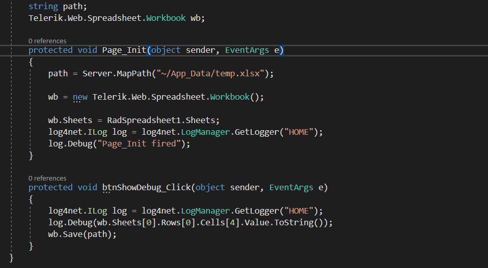 In the image I attempt to get a cell value (and save a referenced workbook) in a button click event.