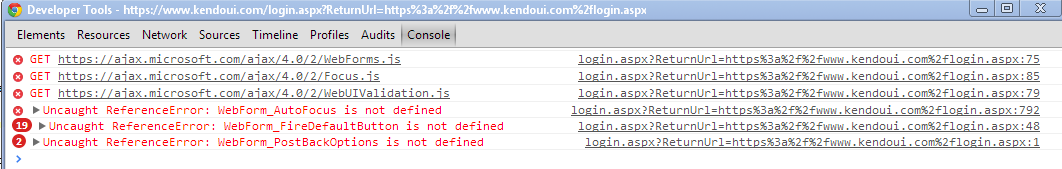 This is a problem with the ajax cdn, which we are working on. If you are still experiencing this issue (which means that the cdns are down), what I can suggest is to go to telerik.com and login from there.Then you will be able to go back to kendoui.com and be automatically be logged in there.