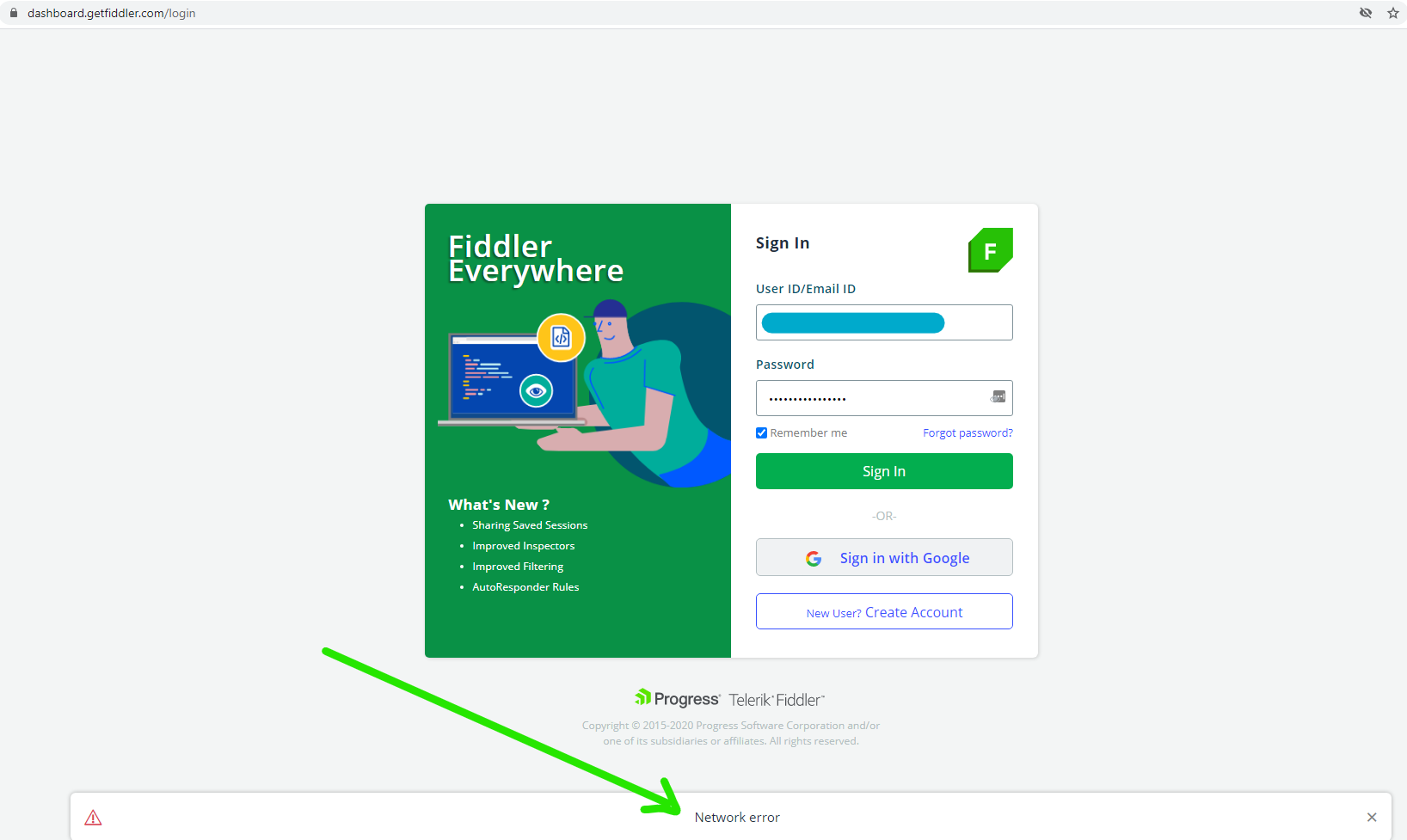 And when I try to login in "https://dashboard.getfiddler.com/login", I get "Network Error" message.