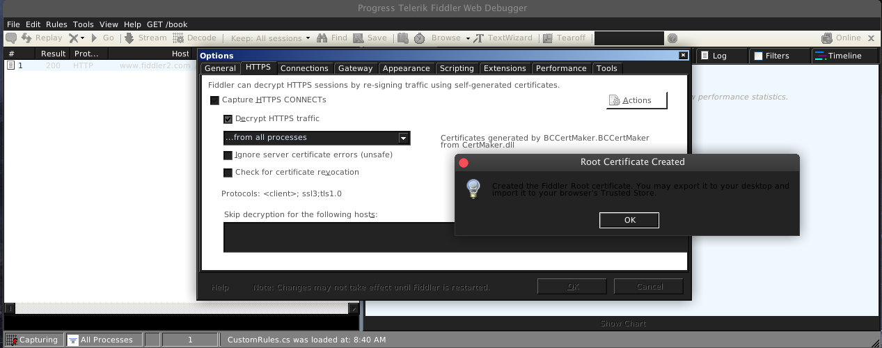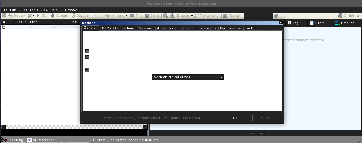 Love using Fiddler on Windows, so I thought I would try it on Linux. When I go into the settings, I can't read the settings. But when I go to the HTTPS tab and check the "Decrypt HTTPS traffic" checkbox, a dialog pops up which allows me to read the settings in that tab, until I click OK and then the letters go away again. Screenshots attached.