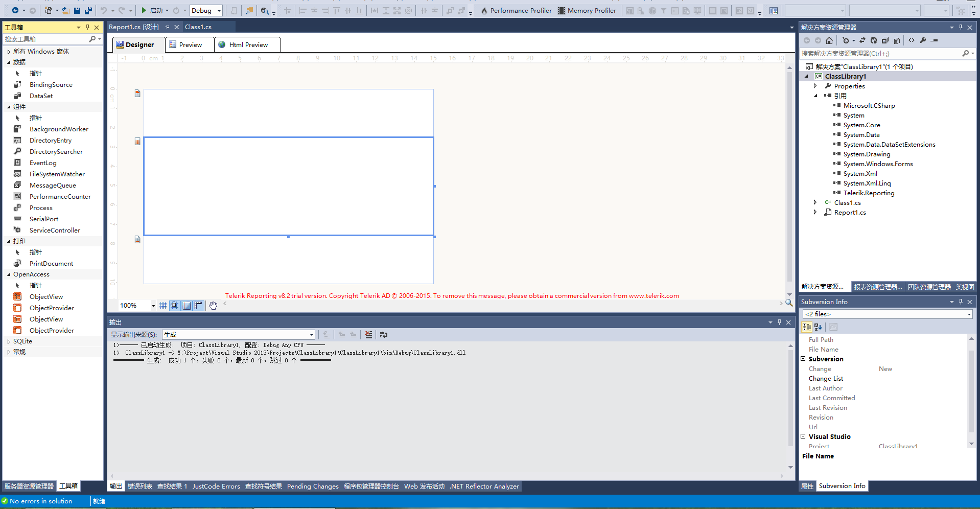 Test to start Visual Studio and then to create a new ClassLibrary project that meets Telerik Reporting system requirements. Then add a new blank report in the project - How To: Create a Report (Visual Studio) ,and check if the report can be opened in the VS Report Designer and if the VS Toolbox is populated with items.
