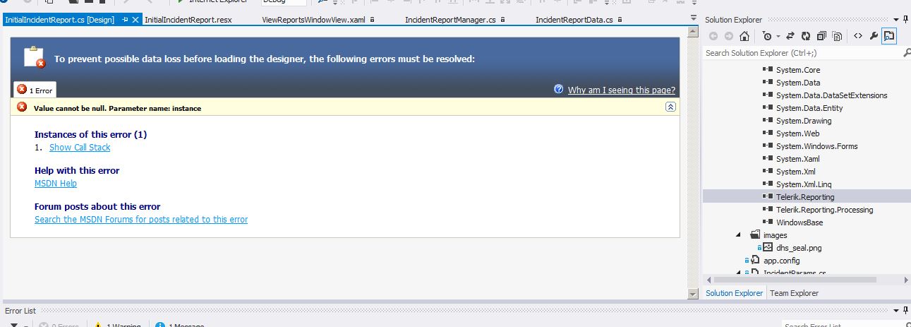 I am trying to modify a report but when I go to view it in the designer I get the following error "Value cannot be null. Parameter name: instance".