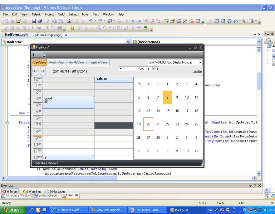 private void radCalendar1_SelectionChanged(object sender, EventArgs e) {     this.radScheduler1.ActiveViewType = SchedulerViewType.Day;     this.radScheduler1.FocusedDate = this.radCalendar1.SelectedDate; }Let me know if that's what you needed.