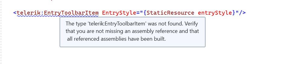 That error tells me the project is using an older version, please update to 6.3.0 and rebuild. Then, you will see the new toolbar item types (BusyIndicatorToolbarItem and EntryToolbarItem).