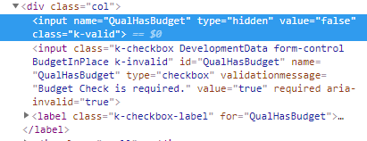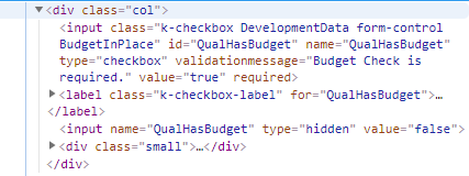 Here is a sample of the two input controls generated by the CheckBoxFor (note that we manipulated a few of the classes and attributes on the first input after the controls are generated):