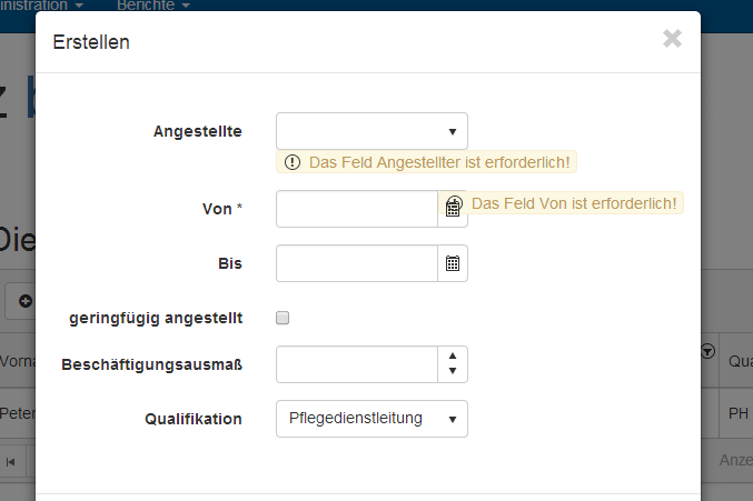 01.<!-- Modal -->02.<div class="modal fade" id="modal-create-employment-status" tabindex="-1" role="dialog" aria-labelledby="modal-create-employment-status-label" aria-hidden="true">03. <div class="modal-dialog">04. <div class="modal-content">05. <div class="modal-header">06. <button type="button" class="close" data-dismiss="modal" aria-hidden="true"><span class="glyphicon glyphicon-remove"></span></button>07. <h4 class="modal-title" id="modal-create-employment-status-label">@GlobalResources.Create</h4>08. </div>09. <div class="modal-body">10. 11. <form id="form-create-employment-status" class="form-horizontal" role="form">12. 13. 14. <input type="hidden" id="employment-status-id" name="employment-status-id" />15. 16. <div class="form-group">17. <span class="k-invalid-msg" data-for="from"></span>18. <span class="k-invalid-msg" data-for="dropdown-employee"></span>19. </div>20. 21. <div class="form-group">22. <label for="dropdown-employee" class="col-sm-4 control-label">@GlobalResources.Employee</label>23. <div class="col-sm-4">24. <input class="" id="dropdown-employee" name="employee" required=""/>25. </div>26. </div>27. 28. <div class="form-group">29. <label for="from" class="col-sm-4 control-label">@GlobalResources.From *</label>30. <div class="col-sm-4">31. @(Html.Kendo().DatePicker()32. .HtmlAttributes(new { required = "" })33. .Name("from")34. .Format("yyyy-MM-dd")35. )36. </div>37. </div>38. 39. <div class="form-group">40. <label for="to" class="col-sm-4 control-label">@GlobalResources.To</label>41. <div class="col-sm-4">42. @(Html.Kendo().DatePicker()43. .Name("to")44. .Format("yyyy-MM-dd")45. )46. </div>47. </div>48. 49. <div class="form-group">50. <label for="marginal-employment" class="col-sm-4 control-label">@GlobalResources.MarginalEmployment</label>51. <div class="col-sm-4">52. <label class="checkbox">53. <input id="marginal-employment" type="checkbox" class="" name="marginal-employment">54. </label>55. </div>56. </div>57. 58. <div class="form-group">59. <label for="amount-of-employment" class="col-sm-4 control-label">@GlobalResources.AmountOfEmployment</label>60. <div class="col-sm-4">61. @(Html.Kendo().NumericTextBox()62. .IncreaseButtonTitle(GlobalResources.Increase)63. .DecreaseButtonTitle(GlobalResources.Decrease)64. .Name("amount-of-employment")65. .Format("p")66. // .Min(0)67. )68. </div>69. </div>70. 71. <div class="form-group">72. <label for="dropdown-qualification" class="col-sm-4 control-label">@GlobalResources.Qualification</label>73. <div class="col-sm-4">74. <input class="" id="dropdown-qualification" name="qualification" />75. </div>76. </div>77. 78. </form>79. </div>80. <div class="modal-footer">81. <button type="button" class="btn btn-default" data-dismiss="modal">@GlobalResources.Cancel</button>82. <button type="button" class="btn btn-primary" onclick="$('#form-create-employment-status').submit();">@GlobalResources.Save</button>83. </div>84. </div>85. </div>86.</div>001.openEditModal: function(event) {002. event.preventDefault();003. var dataItem = this.dataItem($(event.currentTarget).closest("tr"));004. 005. $("#dropdown-employee-list").remove();006. $("#dropdown-employee").kendoDropDownList({007. dataTextField: "Text",008. dataValueField: "Value",009. dataSource: {010. transport: {011. read: {012. dataType: "json",013. url: "/Employee/GetEmployee?employeeId=" + dataItem.EmployeeId014. }015. },016. schema: {017. data: "items",018. total: "count"019. }020. },021. value: dataItem.EmployeeId022. });023. $("#dropdown-qualification-list").remove();024. $("#dropdown-qualification").kendoDropDownList({025. dataTextField: "Text",026. dataValueField: "Value",027. dataSource: {028. transport: {029. read: {030. dataType: "json",031. url: "/Employee/GetQualifications"032. }033. },034. schema: {035. data: "items",036. total: "count"037. }038. },039. value: dataItem.Qualification.Id040. });041. 042. $("#from").kendoValidator({043. rules: {044. //implement your custom date validation045. dateValidation: function (input) {046. var currentDate = kendo.parseDate($(input).val(), "dd.MM.yyyy", "de-DE");047. //Check if Date parse is successful048. if (!currentDate) {049. return false;050. }051. return true;052. }053. },054. messages: {055. //Define your custom validation massages056. required: "Das Feld Von ist erforderlich!",057. dateValidation: "Datumsformat ungültig!"058. }059. });060. 061. $("#dropdown-employee").kendoValidator({062. rules: {063. //implement your custom date validation064. dateValidation: function (input) {065. var currentDate = kendo.parseDate($(input).val(), "dd.MM.yyyy", "de-DE");066. //Check if Date parse is successful067. if (!currentDate) {068. return false;069. }070. return true;071. }072. },073. messages: {074. //Define your custom validation massages075. required: "Das Feld Angestellter ist erforderlich!",076. dateValidation: "Datumsformat ungültig!"077. }078. });079. 080. // fill up fields081. $("#employment-status-id").val(dataItem.EmploymentStatusId);082. $("#from").data("kendoDatePicker").value(dataItem.From);083. $("#to").data("kendoDatePicker").value(dataItem.To);084. if (dataItem.MarginalEmployment) {085. $("#marginal-employment").prop('checked', true);086. }087. else {088. $("#marginal-employment").prop('checked', false);089. }090. 091. $("#amount-of-employment").data("kendoNumericTextBox").value(dataItem.ContractPercent);092. //093. 094. $("#form-create-employment-status").unbind("submit");095. $("#form-create-employment-status").submit(function (e) {096. e.preventDefault();097. $.ajax({098. type: "POST",099. url: "/Employee/UpdateOrCreateEmploymentStatus",100. data: $("#form-create-employment-status").serialize()101. }).done(function (data, textStatus, jqXHR) {102. $('#EmploymentStatusGrid').data('kendoGrid').dataSource.read();103. $('#EmploymentStatusGrid').data('kendoGrid').refresh();104. $('#modal-create-employment-status').modal('hide');105. })106. .fail(function (jqXHR, textStatus, errorThrown) {107. alert(errorThrown);108. });109.