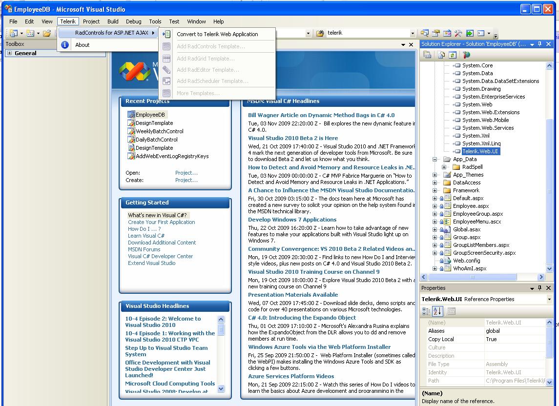 - Change the version of RadControls for ASP.NET AJAX the project uses.
