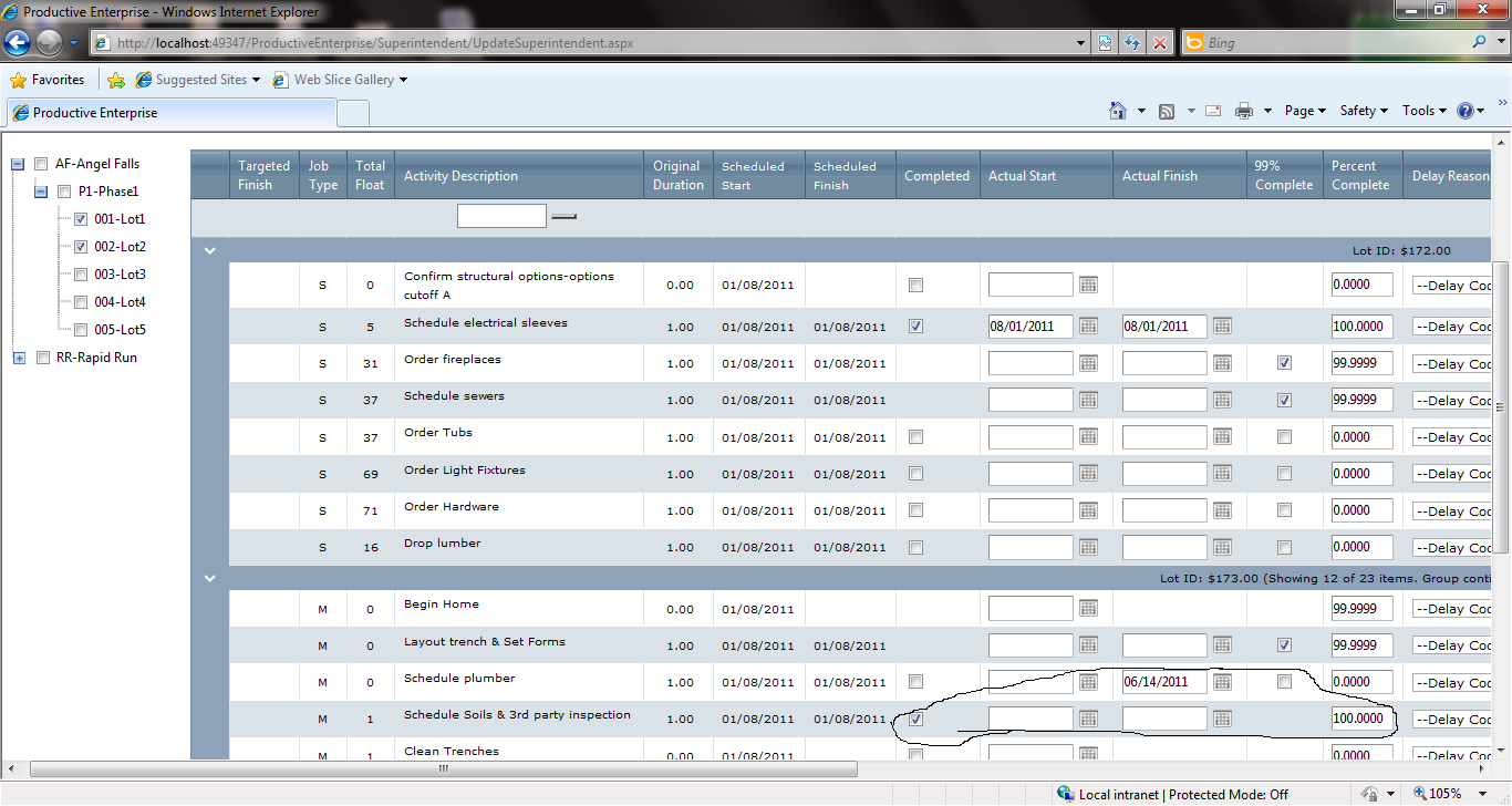 <telerik:RadGrid ID="RadGrid1" Skin="WebBlue" runat="server" AllowFilteringByColumn="true" AutoGenerateColumns="false" ShowStatusBar="True" GridLines="None" AllowPaging="true" PageSize="20" AllowSorting="True" onitemdatabound="RadGrid1_ItemDataBound"> <MasterTableView GroupLoadMode="Client"> <Columns> <telerik:GridTemplateColumn UniqueName="Complete" HeaderText="Completed" AllowFiltering="false"> <ItemTemplate> <asp:Panel ID="Panel1" runat="server" Width="2px"> <asp:CheckBox ID="chkComplete" runat="server"/> </asp:Panel> </ItemTemplate> </telerik:GridTemplateColumn> <telerik:GridTemplateColumn UniqueName="gridActFinish" HeaderText="Actual Finish" AllowFiltering="false"> <ItemTemplate> <telerik:RadDatePicker ID="actfinish" runat="server" Width="100px" MaxDate='<%# Convert.ToDateTime(Eval("early_start_display")).ToString("dd/MMM/yyyy") %>' Calendar-ShowOtherMonthsDays="false" Calendar-ShowRowHeaders="false" DbSelectedDate='<%# Bind("actual_finish") %>' DateInput-DateFormat="MM/dd/yyyy"> <ClientEvents OnDateSelected ="actfinish_OnDateSelected" > </ClientEvents> </telerik:RadDatePicker> </ItemTemplate> </telerik:GridTemplateColumn> <telerik:GridTemplateColumn UniqueName="perComplete" HeaderText="99% Complete" AllowFiltering="false"> <ItemTemplate> <asp:Panel ID="Panel2" runat="server"> <asp:CheckBox ID="Chkbox" runat="server"/> </asp:Panel> </ItemTemplate> </telerik:GridTemplateColumn> <telerik:GridTemplateColumn UniqueName="perComplete" HeaderText="Percent Complete" AllowFiltering="false"> <ItemTemplate> <telerik:radnumerictextbox id="pct" runat="server" text='<%#Eval("pct") %>' minvalue="0" maxvalue="100" width="50px" FocusedStyle-BackColor="Yellow" NumberFormat-DecimalDigits="0"> <numberformat allowrounding="true" decimaldigits="4"/> </telerik:radnumerictextbox> </ItemTemplate> </telerik:GridTemplateColumn> </Columns> </MasterTableView> </telerik:RadGrid>