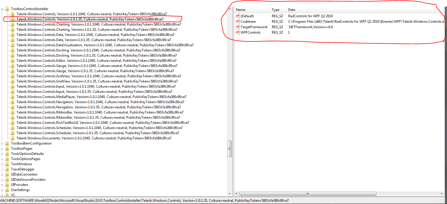 You can also check this registry key HKEY_LOCAL_MACHINE\SOFTWARE\Wow6432Node\Microsoft\VisualStudio\10.0\ToolboxControlsInstaller\Telerik.Windows.Controls, Version=1.0.1.35, Culture=neutral, PublicKeyToken=5803cfa389c90ce7 and see if everything is like in the screenshot I have attached. Note that the path should point to the place where Telerik binaries are installed. Also could you check if you have RadSlider and RadProgressBar in the toolbox.