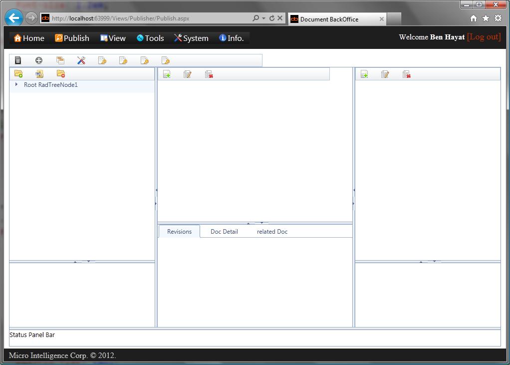 <%@ Page Title="" Language="C#" MasterPageFile="~/Site.Master" AutoEventWireup="true" CodeBehind="Publish.aspx.cs" Inherits="DBO_Web.Views.Publisher.Publish" %><asp:Content ID="Content1" ContentPlaceHolderID="MainContent" runat="server"> <div id="ParentDivElement" style="height: 100%;"> <%--_________________________________________________________________________________________________--%> <telerik:RadSplitter ID="RadSplitter1" runat="server" Height="100%" Width="100%" BackColor="#F4F9FE" VisibleDuringInit="False" Orientation="Horizontal"> <telerik:RadPane ID="TopPane" runat="server" Height="100" MinHeight="85" MaxHeight="150" Scrolling="none"> <!-- Place the content of the pane here --> </telerik:RadPane> <telerik:RadSplitBar ID="RadsplitbarTop" runat="server" CollapseMode="Forward" /> <telerik:RadPane ID="MainPane" runat="server" Scrolling="none" MinWidth="500"> <telerik:RadSplitter ID="NestedSplitter" runat="server" LiveResize="true"> <telerik:RadPane ID="LeftPane" runat="server" Width="200" MinWidth="150" MaxWidth="400"> <!-- Place the content of the pane here --> </telerik:RadPane> <telerik:RadSplitBar ID="VerticalSplitBar" runat="server" CollapseMode="Forward" /> <telerik:RadPane ID="ContentPane" runat="server"> <!-- Place the content of the pane here --> </telerik:RadPane> </telerik:RadSplitter> </telerik:RadPane> </telerik:RadSplitter> <%--_________________________________________________________________________________________________--%> </div></asp:Content>Hope this helps to get this resolved. I'm using the latest 2012 Q2.