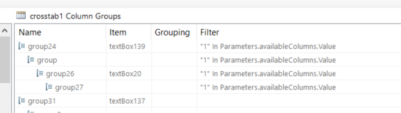 The only thing I can think of is Parameters.availableColumns.Value isn't populated when it hits that expression in the Column Grouping. Is that right? And if so how can I go about giving the user the option to select the columns they want to show?