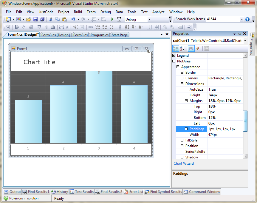 I have been able to get most of my required chart layout customizations to work. The only thing I can't figure out is how to get rid of the left and right margins in the plotted data and the right margin between the right side of the plot area and right side of the chart. I tried messing with the margins in the plot area > appearance > dimension area but it didn't work. I would set all the margins to 0 and they would come back. I would also set autosize to false, but this causes major exceptions in the designer. I also tried messing with the autosizing in the plot area > appearance > position area but this also causes major exceptions in the designer. I just want my chart to look normal with the plotted data taking up the full widh of the plot area and no margin to the right. This should really be the default layout. Is it possible to achieve this in the RAD charts? Is this something that is being worked on?