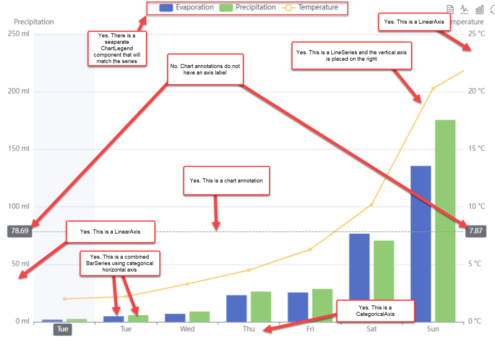 Although you can move the temperature vertical axis to the right (with LinearAxis HorizontalLocation=Right), you won't be able to use it in the same plot area as the left vertical axis.