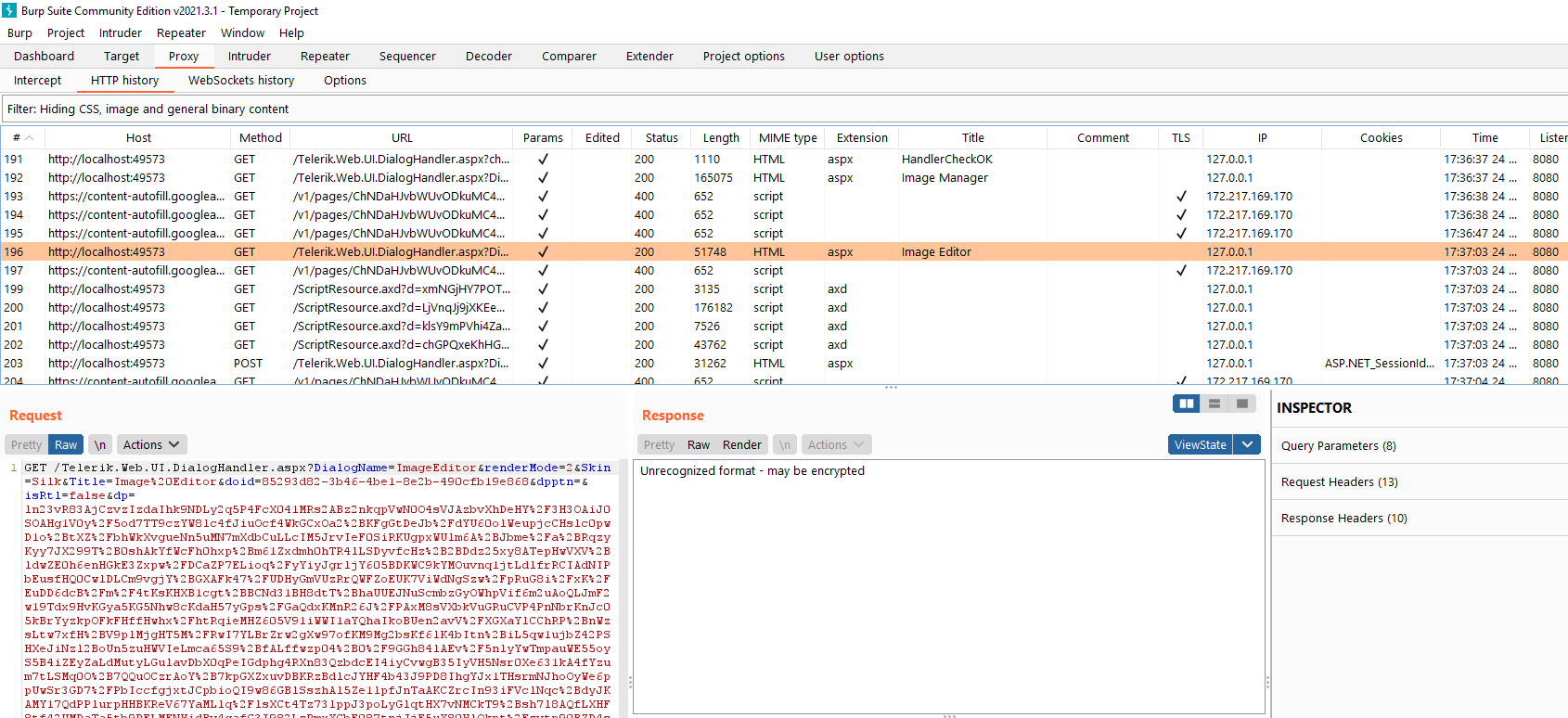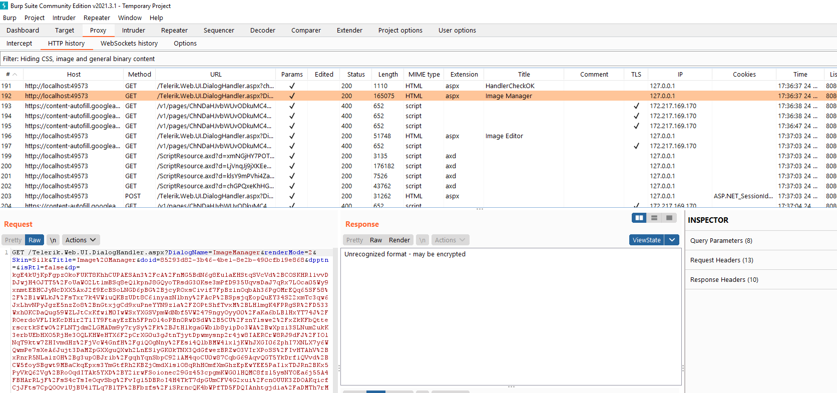 The viewstate or application's pages are already encrypted but looking at the Burp output of the response from a POST to the Telerik.UI.DialogHandler (ImageMananger) it seems the Telerik view state in the response appears not to be.