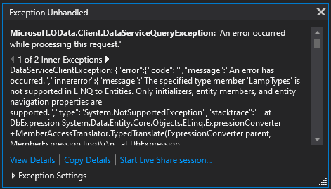 I have an odata entity that has been expanded to include 2 other tables. When I try to filter the entity by one of the columns I am greeted with a LINQ error (I will include a screenshot of the error). I was wondering if there is anyway to be able to filter by one of the expanded columns? I am using a QueryableDataServiceCollectionView that populates my RadGridView.