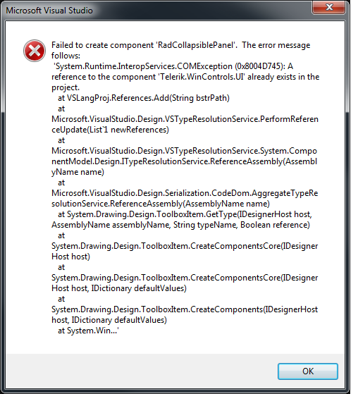 Every time I try to add ANY control I get a messagebox saying: "Failed to created component Rad.... The error message follows"....