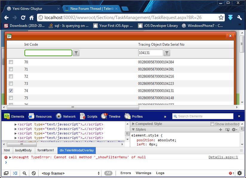 using System;using System.Collections.Generic;using System.Linq;using System.Web;using System.Web.UI;using System.Web.UI.WebControls;using Getron.AAM.EntityManagement;using System.Data;using Telerik.Web.UI;using Getron.Core.BussinesRuleEngine;using Getron.Core.Base.Web;using System.Text;public partial class Sections_TaskManagement_Controls_SelectRows : EntityProtectedUserControl{ private void Page_Load(object sender, System.EventArgs e) { if (Request.QueryString["ControlIntCode"] != null && Getron.Core.Tools.DataTableFieldOperation.ToInt64(Request.QueryString["ControlIntCode"].ToString(), 0) > 0) { RequestTemplateControl templateControl = new RequestTemplateControl(Getron.Core.Tools.DataTableFieldOperation.ToInt64(Request.QueryString["ControlIntCode"].ToString(), 0)); SqlDataSource1.ConnectionString = templateControl.DbSession.Connection.ConnectionString; SqlDataSource1.SelectCommand = templateControl.Query; this.RadGrid1.MasterTableView.Columns.Clear(); GridClientSelectColumn selectCol = new GridClientSelectColumn(); this.RadGrid1.MasterTableView.Columns.Add(selectCol); } }}<%@ Control Language="C#" AutoEventWireup="true" CodeFile="SelectRows.ascx.cs" Inherits="Sections_TaskManagement_Controls_SelectRows" %> <telerik:RadAjaxManager ID="RadAjaxManager1" runat="server"> <AjaxSettings> <telerik:AjaxSetting AjaxControlID="RadGrid1"> <UpdatedControls> <telerik:AjaxUpdatedControl ControlID="RadGrid1" LoadingPanelID="RadAjaxLoadingPanel1" /> </UpdatedControls> </telerik:AjaxSetting> </AjaxSettings> </telerik:RadAjaxManager> <telerik:RadAjaxLoadingPanel ID="RadAjaxLoadingPanel1" runat="server" Skin="Hay" /> <script type="text/javascript"> function GetRadWindow() { var oWindow = null; if (window.radWindow) oWindow = window.radWindow; else if (window.frameElement.radWindow) oWindow = window.frameElement.radWindow; return oWindow; } function returnToParent() { //create the argument that will be returned to the parent page var oArg = new Object(); //get the city's name oArg.cityName = "deneme"; //get the selected date from RadDatePicker //oArg.selDate = datePicker.get_selectedDate().toLocaleDateString(); //get a reference to the current RadWindow var oWnd = GetRadWindow(); //Close the RadWindow and send the argument to the parent page if (oArg.selDate && oArg.cityName) { oWnd.close(oArg); } } </script> <telerik:RadGrid AutoGenerateColumns="true" ID="RadGrid1" DataSourceID="SqlDataSource1" EnableTheming="true" Width="760px" AllowFilteringByColumn="True" AllowSorting="True" PageSize="15" ShowFooter="True" AllowPaging="True" runat="server" GridLines="None" EnableLinqExpressions="false"> <PagerStyle Mode="NextPrevAndNumeric" /> <GroupingSettings CaseSensitive="false" /> <MasterTableView AllowFilteringByColumn="True" ShowFooter="True" TableLayout="Auto"></MasterTableView> <ClientSettings> <Selecting AllowRowSelect="true" /> </ClientSettings> </telerik:RadGrid> <asp:SqlDataSource ID="SqlDataSource1" ProviderName="System.Data.SqlClient" runat="server"> </asp:SqlDataSource> <hr /> <button title="Submit" id="close" onclick="returnToParent(); return false;">Seçilenleri Onayla</button>