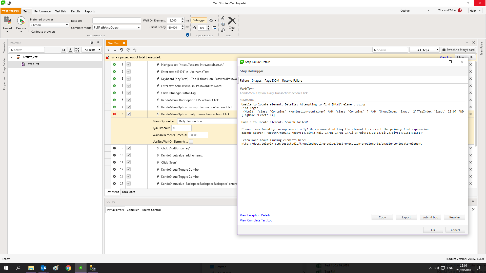 1. Regarding the "KendoMenuOption" element you could try using the backup search logic which is using xpath and is shown on the screenshot. Please bear in mind that xpath find logic tends to be unstable and is susceptible to page structure changes.