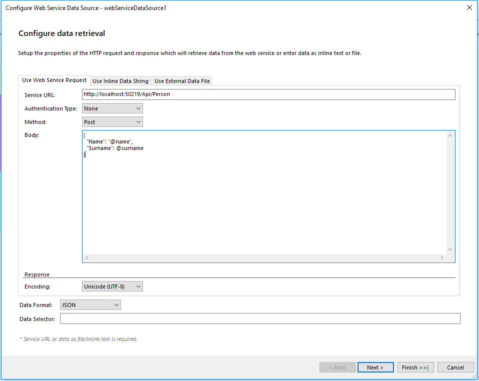 I am trying to connect to a web api via the webservice data connector in the standalone report designer. I have been able to return the data in json format via Postman with the same query parameters, but when i try to configure the data source in the report designer, I get the following error.
