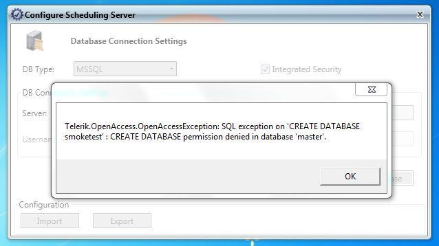 As indicated by the error message - the Scheduling configuration app cannot make the SQL server create the intended database. It seems the account you're using doesn't have the necessary permissions.