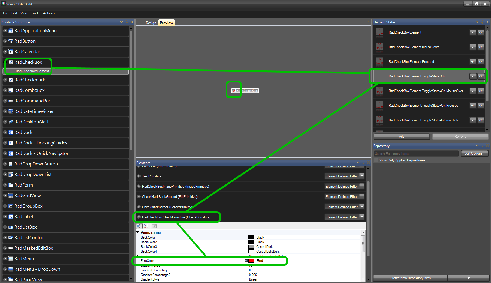 I am designing a style for CheckBox control and the problem i face is "I cannot find property to change CheckMark color and backColor of the box for check mark. The property i guess would have worked is "RadCheckBoxElement.ToggleState=Ok.Pressed. But this property produces arrows etc ( for whatever shape i choose from available options)