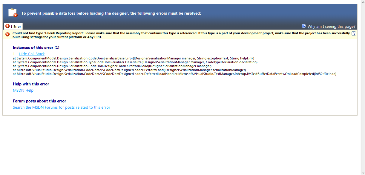 I just installed Trial version of Telerik Reporting Q3 2010 with VS2008 & VS2010 Support. But when I create report, I get above error. I have attached screen shot here. How to get pass this error? I am using Windows 7.
