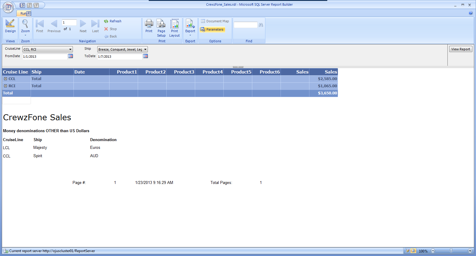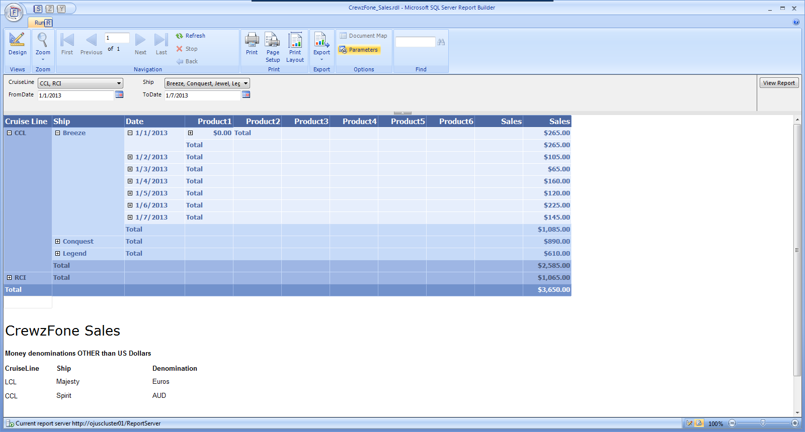 <telerik:radgrid id="RadGrid1" runat="server" GridLines="None" AutoGenerateColumns="False" AllowPaging="True" ShowGroupPanel="True" ShowFooter="True" > <PagerStyle Mode="NextPrevNumericAndAdvanced"></PagerStyle> <MasterTableView GroupsDefaultExpanded="false" GroupLoadMode="Client" ShowGroupFooter="True" pagesize="50" ExpandCollapseColumn-Groupable="True"> <RowIndicatorColumn Visible="True"> <HeaderStyle Width="20px"></HeaderStyle> </RowIndicatorColumn> <ExpandCollapseColumn Visible="True"> <HeaderStyle Width="19px"></HeaderStyle> </ExpandCollapseColumn> <Columns> <telerik:GridBoundColumn DataField="CruiseLine" ReadOnly="true"> </telerik:GridBoundColumn> <telerik:GridBoundColumn DataField="Ship" ReadOnly="true"> </telerik:GridBoundColumn> <telerik:GridBoundColumn DataField="Date" ReadOnly="true" DataFormatString="{0:M/d/yyyy}"> </telerik:GridBoundColumn> <telerik:GridBoundColumn DataField="Product1Cash" ReadOnly="true" DataFormatString="{0:C2}"> </telerik:GridBoundColumn> <telerik:GridBoundColumn DataField="Product2Cash" ReadOnly="true" DataFormatString="{0:C2}"> </telerik:GridBoundColumn> <telerik:GridBoundColumn DataField="Product3Cash" ReadOnly="true" DataFormatString="{0:C2}"> </telerik:GridBoundColumn> <telerik:GridBoundColumn DataField="Product4Cash" ReadOnly="true" DataFormatString="{0:C2}"> </telerik:GridBoundColumn> <telerik:GridBoundColumn DataField="Product5Cash" ReadOnly="true" DataFormatString="{0:C2}"> </telerik:GridBoundColumn> <telerik:GridBoundColumn DataField="Product6Cash" ReadOnly="true" DataFormatString="{0:C2}"> </telerik:GridBoundColumn> <telerik:GridBoundColumn DataField="Sales" ReadOnly="true" DataFormatString="{0:C2}"> </telerik:GridBoundColumn> </Columns> <GroupByExpressions> <telerik:GridGroupByExpression> <SelectFields> <telerik:GridGroupByField FieldName="CruiseLine" /> <telerik:GridGroupByField FieldName="Ship" /> <telerik:GridGroupByField FieldName="Date" FormatString="{0:M/d/yyyy}" /> </SelectFields> <GroupByFields> <telerik:GridGroupByField FieldName="CruiseLine" /> <telerik:GridGroupByField FieldName="Ship" /> <telerik:GridGroupByField FieldName="Date" FormatString="{0:M/d/yyyy}" /> </GroupByFields> </telerik:GridGroupByExpression> </GroupByExpressions> </MasterTableView> </telerik:radgrid>