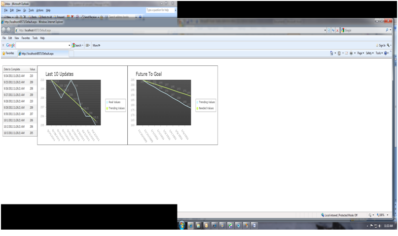 <div class="chartleft"> <telerik:RadChart ID="RadChart1" runat="server" DefaultType="Line" ChartTitle-TextBlock-Text="Last 10 Updates" Width="525"> <PlotArea> <Appearance Dimensions-Margins="18%, 30%, 25%, 10%"> </Appearance> <EmptySeriesMessage Visible="True"> <Appearance Visible="True"> </Appearance> </EmptySeriesMessage> <YAxis IsZeroBased="false"> </YAxis> <XAxis LayoutMode="Inside" AutoScale="false" LabelStep="1" DataLabelsColumn="date" > <Appearance ValueFormat="ShortDate" MajorGridLines-Visible="false" > <LabelAppearance RotationAngle="45" Position-AlignedPosition="Top"> </LabelAppearance> </Appearance> </XAxis> </PlotArea> <Series> <telerik:ChartSeries DataYColumn="realvalues" Name="Real Values" Type="Line"> </telerik:ChartSeries> <telerik:ChartSeries DataYColumn="othervalues" Name="Trending Values" Type="Line"> </telerik:ChartSeries> </Series> </telerik:RadChart> </div>here is the class it is bound to: