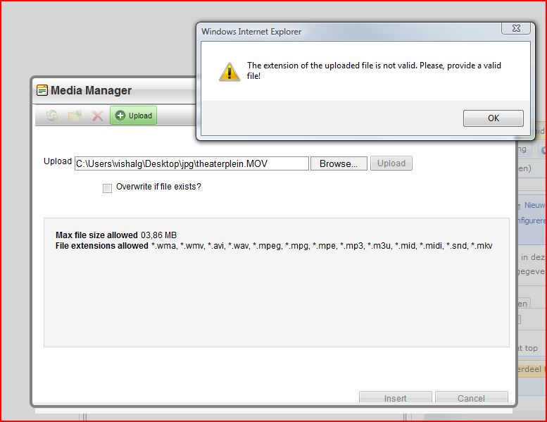 But when i try to upload a .mov file using the MediaManager of the radeditor i get an error that the "extension of the uploaded file is not allowed.. " ( see screenshot).