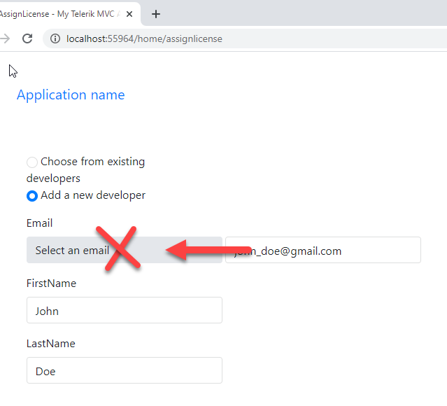 <div class="form-group"> @Html.Label(" ", new { @class = "col-md-2 control-label" }) <div class="col-md-3"> @Html.Kendo().RadioButtonFor(m => m.IsNewDeveloper).Checked(false).HtmlAttributes(new { onchange = "chooseExisting(event)"}) Choose from existing developers </div> <div class="col-md-3"> @Html.Kendo().RadioButtonFor(m => m.IsNewDeveloper).Checked(true).HtmlAttributes(new { onchange = "addNew(event)"}) Add a new developer </div></div><div class="form-group"> @Html.LabelFor(m => m.AssignedDeveloper.Email, new { @class = "col-md-2 control-label" }) <div class="col-md-10"> @Html.Kendo().DropDownList().BindTo(Model.DeveloperEmails).OptionLabel("Select an email").Name("ExistingDeveloper").Events(e=>e.Change("existingDevSelected")).HtmlAttributes(new { style = "width: 280px" }) @Html.Kendo().TextBoxFor(m => m.AssignedDeveloper.Email).HtmlAttributes( new {style = "width: 280px"} ) @Html.ValidationMessageFor(m => m.AssignedDeveloper.Email) </div></div><div class="form-group"> @Html.LabelFor(m => m.AssignedDeveloper.FirstName, new { @class = "col-md-2 control-label" }) <div class="col-md-10"> @Html.Kendo().TextBoxFor(m => m.AssignedDeveloper.FirstName).HtmlAttributes( new { style = "width: 280px" }) @Html.ValidationMessageFor(m => m.AssignedDeveloper.FirstName) </div></div><div class="form-group"> @Html.LabelFor(m => m.AssignedDeveloper.LastName, new { @class = "col-md-2 control-label" }) <div class="col-md-10"> @Html.Kendo().TextBoxFor(m => m.AssignedDeveloper.LastName).HtmlAttributes(new{ style = "width: 280px"}) @Html.ValidationMessageFor(m => m.AssignedDeveloper.LastName) </div></div>
