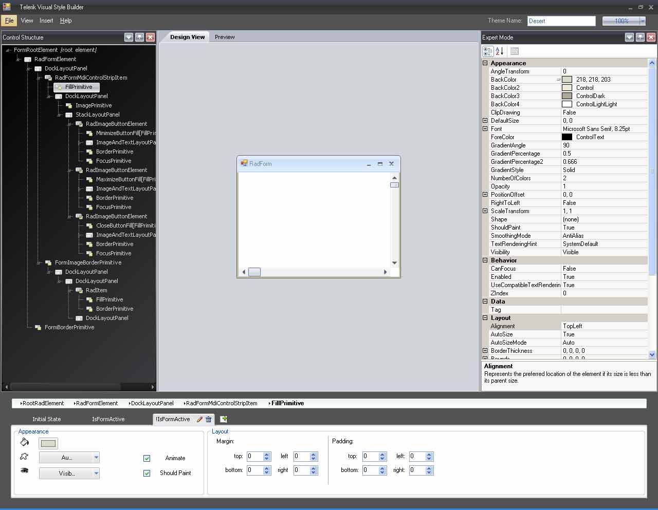 <StylesheetRelations> <RadStylesheetRelation ControlType="Telerik.WinControls.UI.RadTitleBar" ElementType="Telerik.WinControls.RootRadElement" /> <RadStylesheetRelation ControlType="Telerik.WinControls.UI.RadForm" ElementType="Telerik.WinControls.UI.RadFormTitleBarElement" /> </StylesheetRelations>This will allow you to use the style that you created for RadTitleBar in the RadFormTitleBarElement of RadForm.