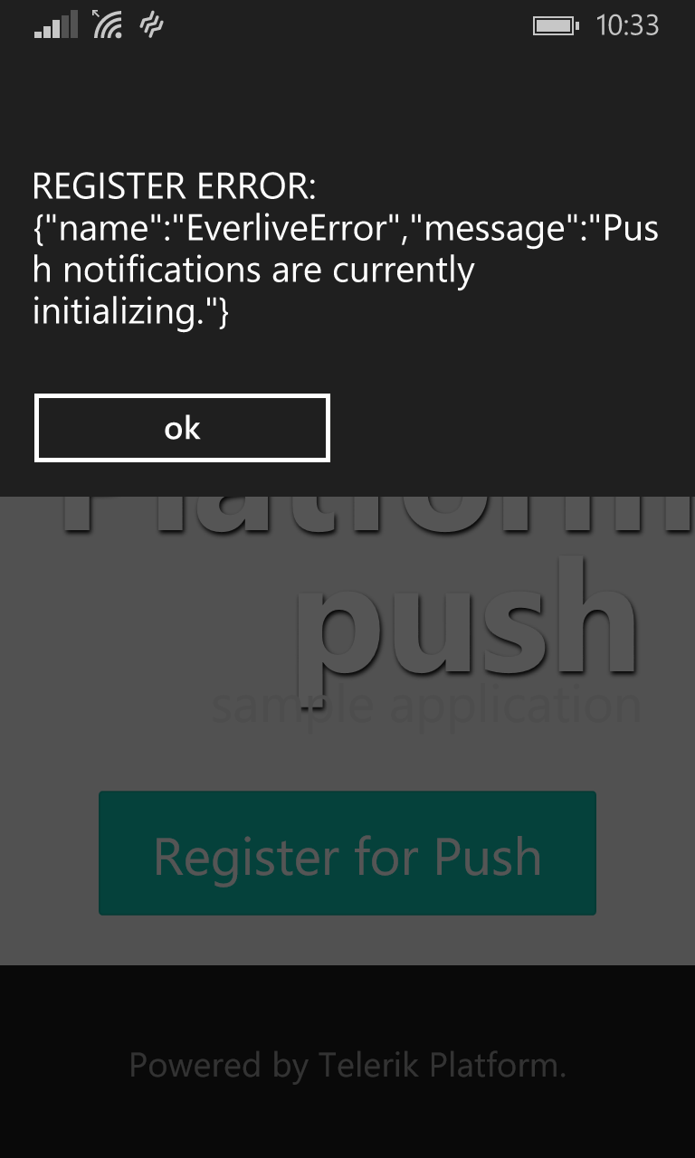8. I clicked the "Register for Push" button, and it never returns or changes. If I click it again, I get an alert: "REGISTER ERROR:
