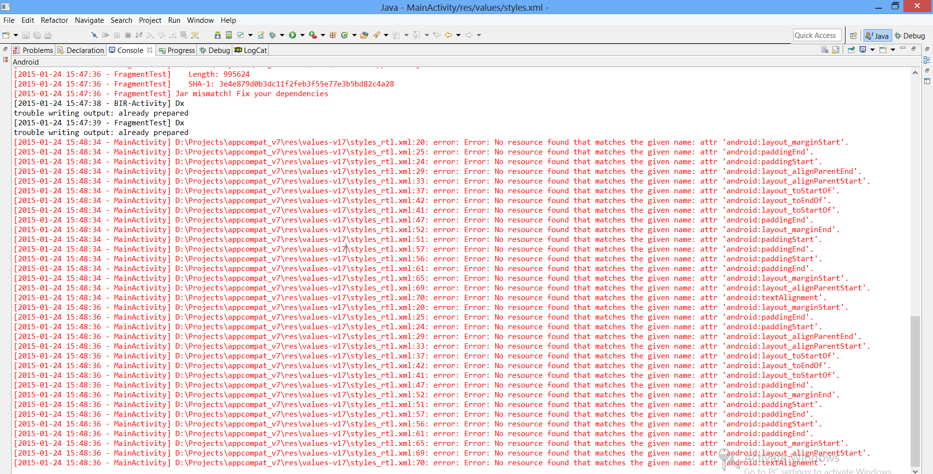 Some other things come to my mind as well. Can you please let us know which version of the appcompat v7 you are using in your project?