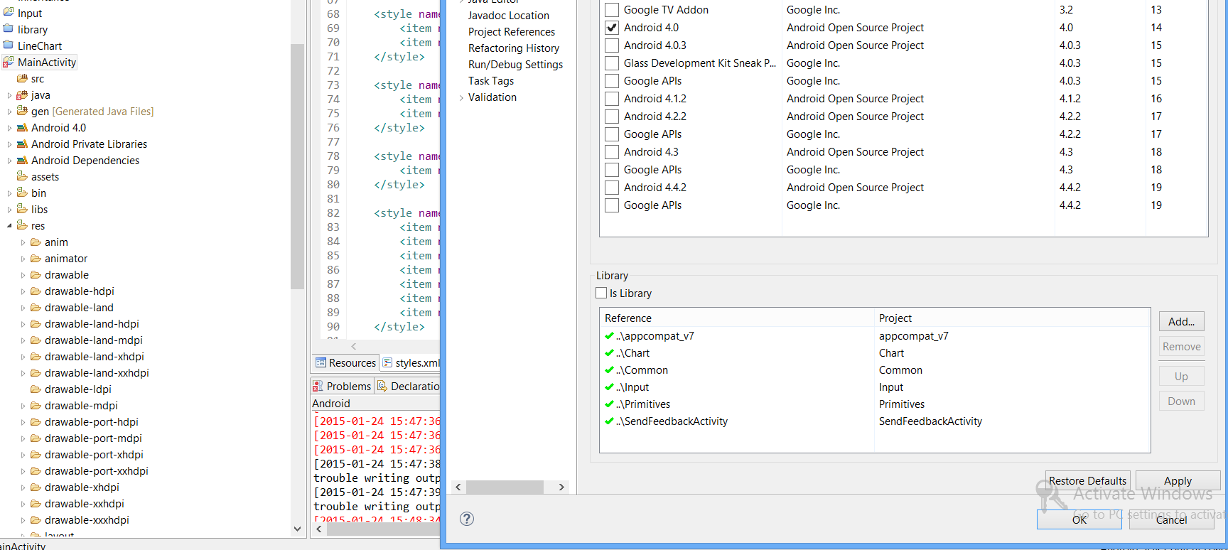 For instance, in your getting started tutorial we point out that you need to reference the 19.+ v7 app compat library. Our controls are built against API Level 19 as discussed here: http://docs.telerik.com/devtools/android/download-and-deployment/system-requirements