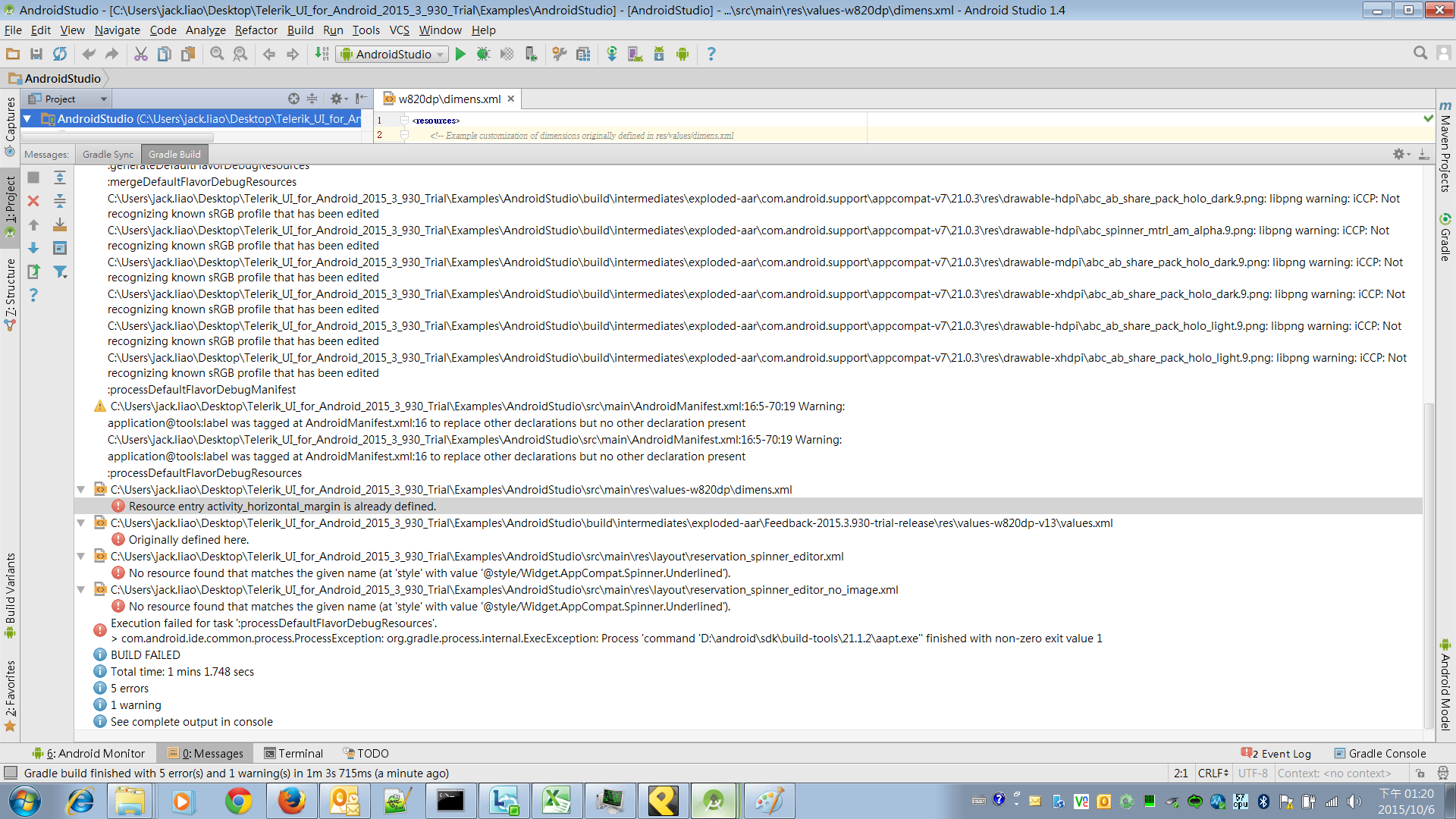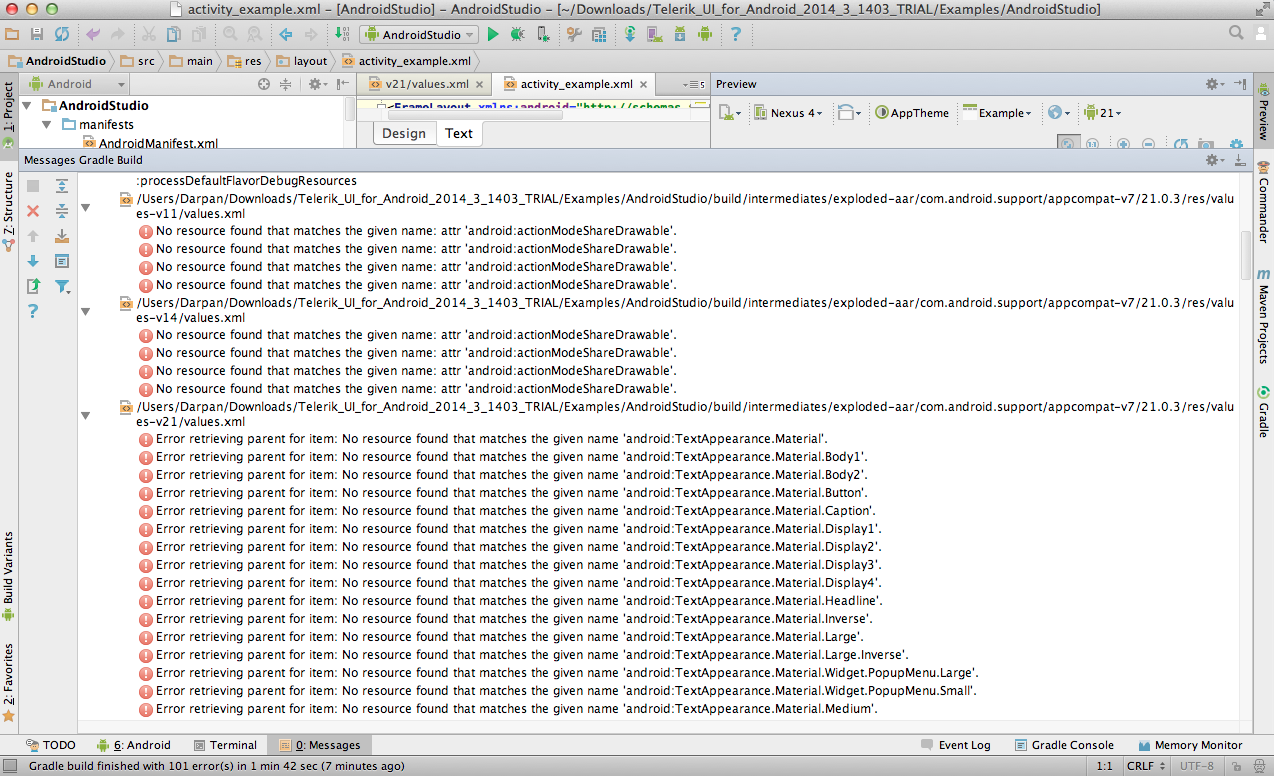 I just followed "Opening the Examples solution" from getting-started http://docs.telerik.com/devtools/android/download-and-deployment/getting-started-for-android-studio and open project . Unfortunately, I've got this errors. Please help me