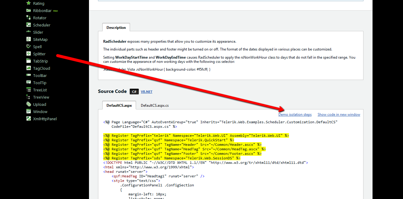 One thing I like to do is the actual example that you see on http://demos.telerik.com/aspnet-ajax/scheduler/examples/customization/defaultcs.aspx. I copied and pasted it into my .aspx and .cs file according to how it is there but I noticed that some files like the Src="~/Common/Header.ascx", etc that is referenced I do not have. Anyway you can point me to how I can test this locally on our server as we are trying to figure out how the Delete and Update is performed as out of the box, not able to get it working.